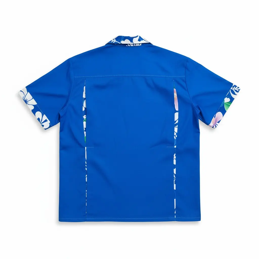 Cette chemise se distingue par son bleu profond éclatant. Elle est sublimée par des empiècements floraux hawaïens aux teintes pastel et chaleureuses. Les fleurs, soigneusement placées sur le devant, le col, les manches et les soufflets dans le dos, apportent un contraste visuel unique et parfaitement équilibré. Chaque détail est pensé pour créer une silhouette rétro affirmée, sans tomber dans l’excès.