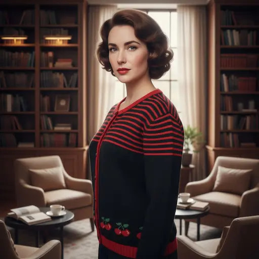 Le haut du gilet est décoré de fines rayures rouges sur fond noir, rappelant les pulls marins vintage. Le bas du vêtement est ponctué de motifs de cerises soigneusement réalisés en jacquard, symbole intemporel de féminité et de bonne humeur. Les bords, poignets et la patte de boutonnage contrastent en rouge vif pour une touche dynamique et élégante.