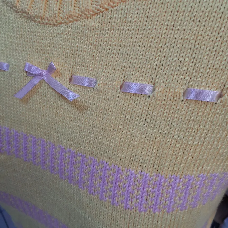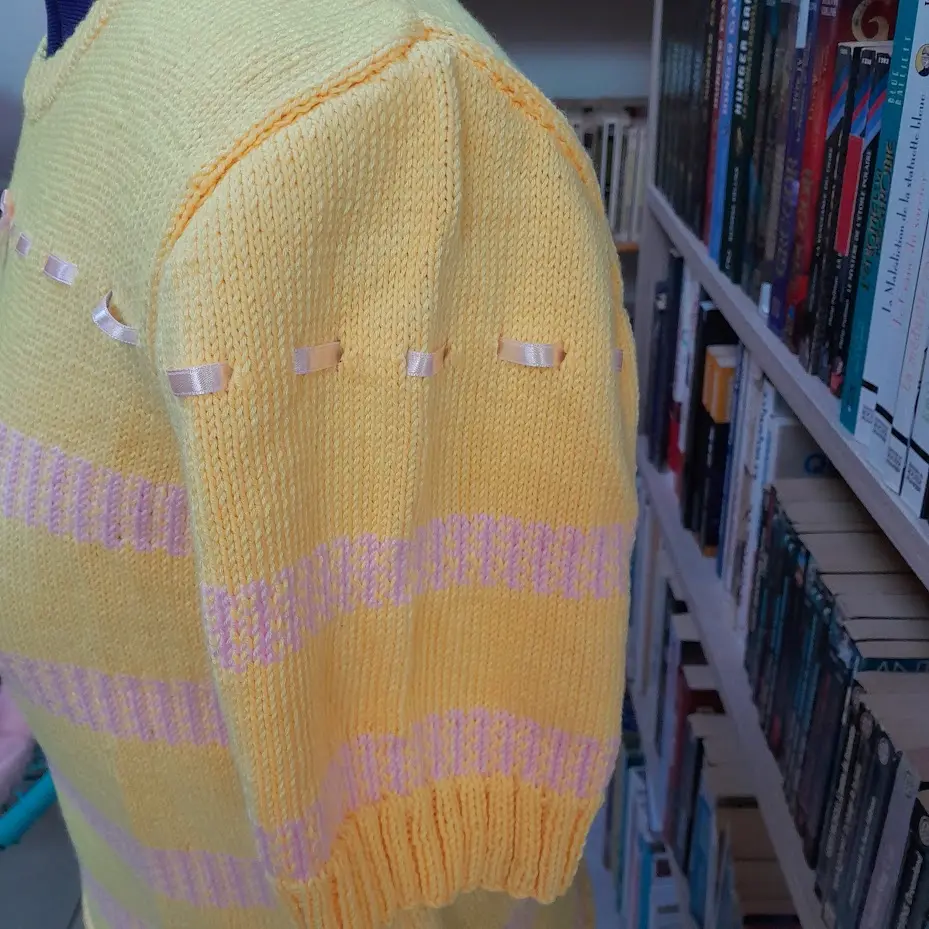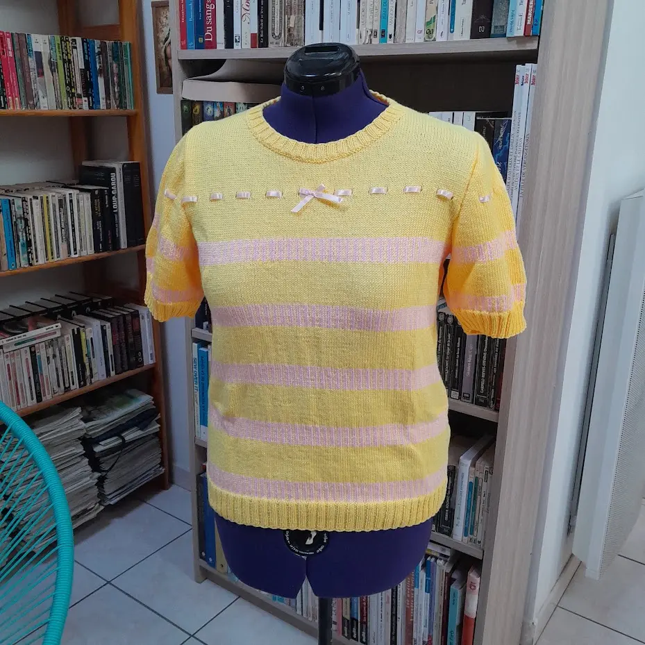 Affirmez votre passion pour le vintage avec ce superbe pull à manches courtes jaune et rose avec ruban, rétro tricoté à la main. Avec son design inspiré des années 50, il incarne parfaitement l’énergie et l’élégance de cette époque iconique.