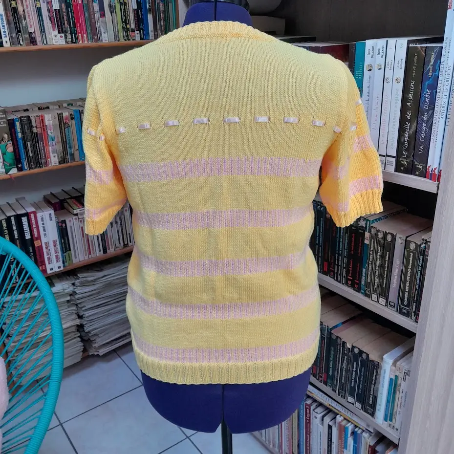 Ce pull jaune et rose se distingue par un motif à rayures. Un ruban rose orne le haut du pull et en fait le tour. Les manches sont courtes. La coupe est droite.