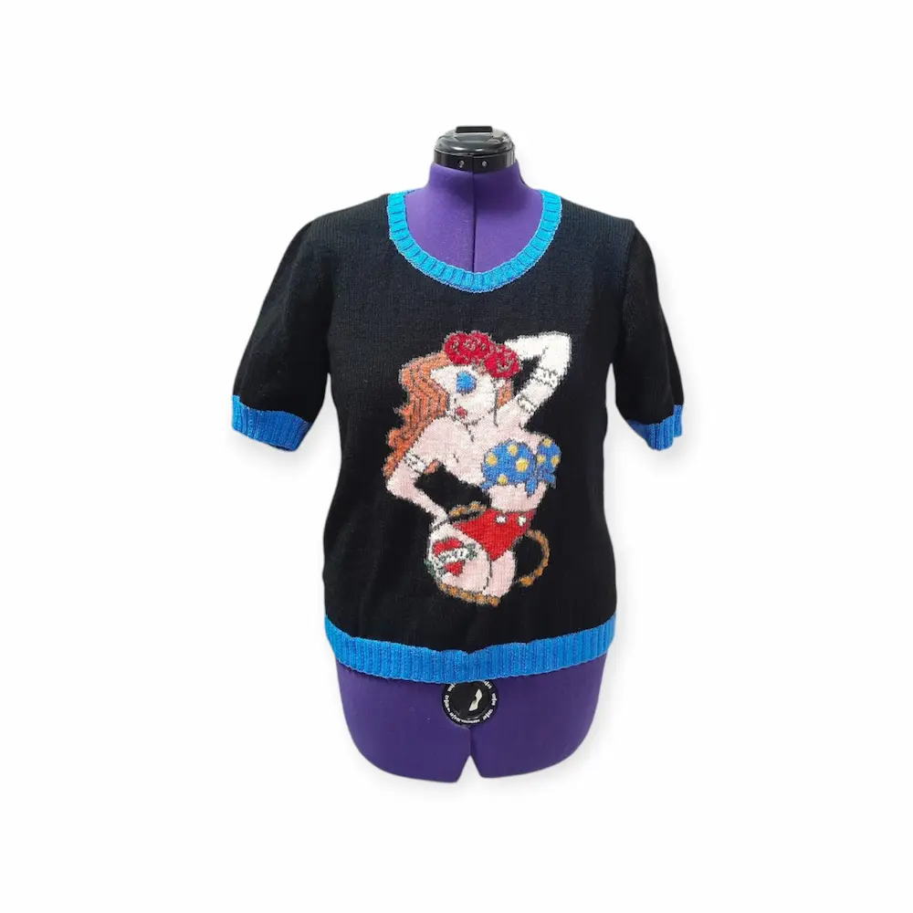 Ce pull noir se distingue par un motif tricoté représentant une Pin-up. Un bleu navy réhausse le col, le bord des manches et le bas du pull . Les manches sont courtes. La coupe est droite.