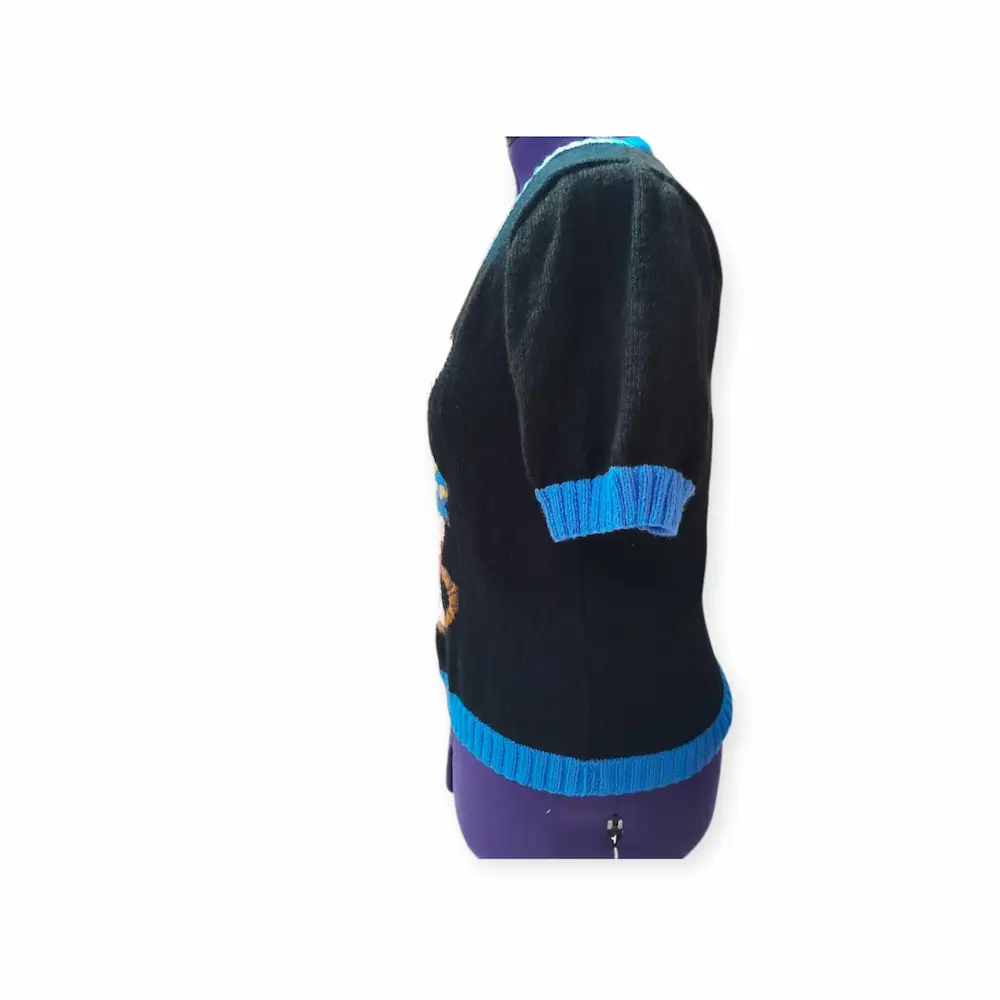 Affirmez votre passion pour le vintage avec ce superbe pull à manches courtes noir avec Pin-up, rétro tricoté à la main. Avec son design inspiré des années 50, il incarne parfaitement l’énergie et l’élégance de cette époque iconique.