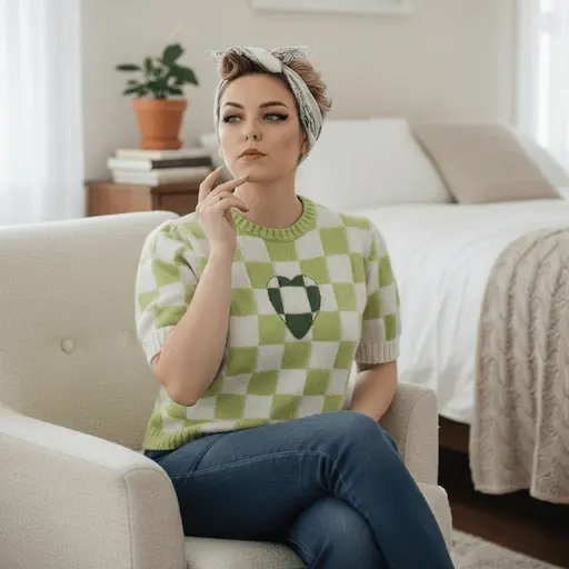 Affirmez votre passion pour le vintage avec ce superbe pull à manches courtes vert à damier avec un cœur, rétro tricoté à la main. Avec son design inspiré des années 50, il incarne parfaitement l’énergie et l’élégance de cette époque iconique.