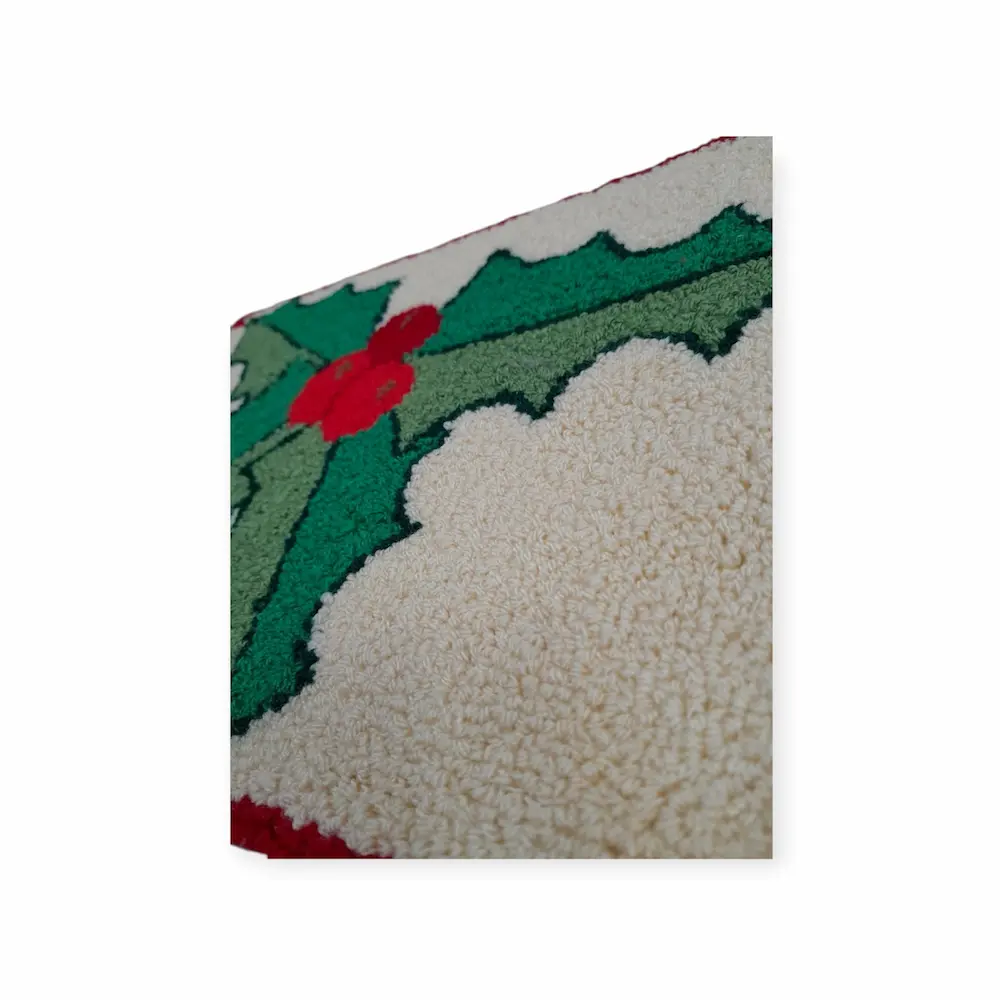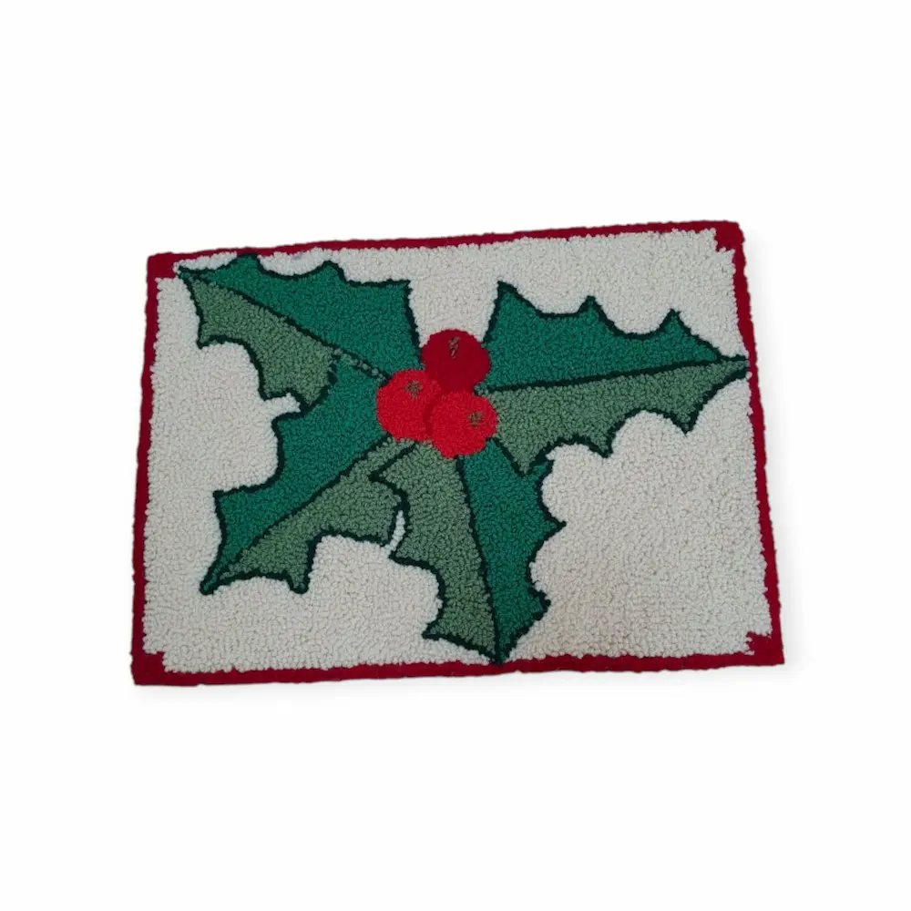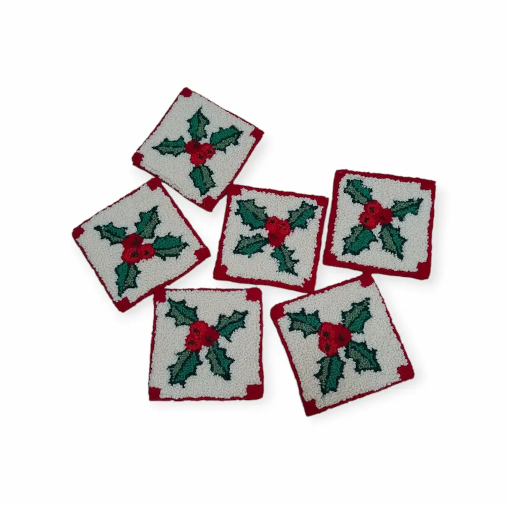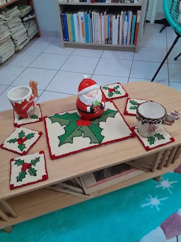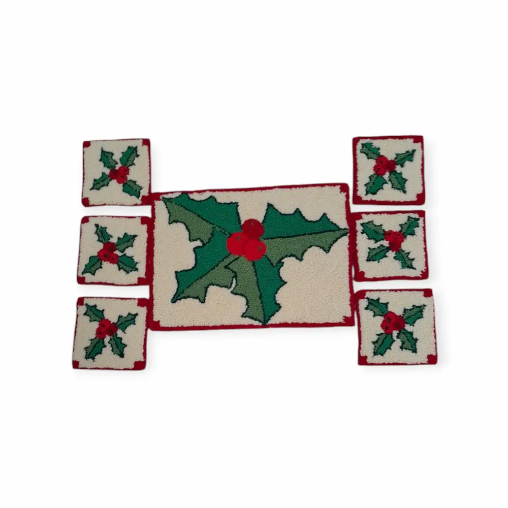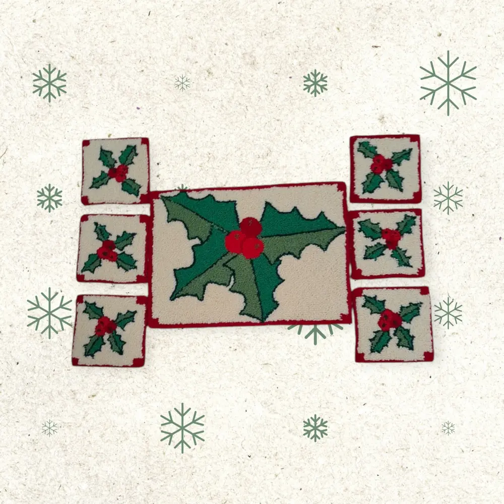 Set Apéro houx de Noël en Punch Needle fait main : tapis central + 6 sous-verres