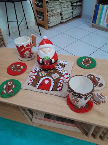 Set apéro Noël artisanal en punch needle : tapis central ( 24x 21 cm)+ 6 sous-verres (10 cm de diamètre). Design unique, protection optimale, charme fait main.