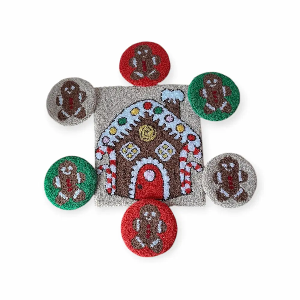• Design : un motif vibrant et original, idéal pour sublimer vos tables d’apéro ou vos soirées à thème. Une maison en pain d’épice orne le tapis central . Un bonhomme à la cannelle est sur chaque sous-verre.